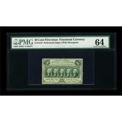<B>Fr. 1310 50c First Issue PMG Choice Uncirculated 64.</B></I> An unusually nice example, with good perforations all around.<BR><BR><b>Shipping:</b> Coins & Currency (<a target="_blank" href="http://www.heritageauctions.com/common/shipping.php">view shipping information</a>)