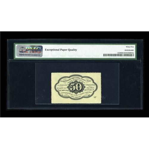 <B>Fr. 1310 50c First Issue PMG Gem Uncirculated 65 EPQ.</B></I> Deep, even perforations all the way around, ideal color, fresh paper surfaces and not a hint of so much as a handling mark. The back centering is almost perfect, and the face, although shy of perfection, is nice for the type. A real beauty.<BR><BR><b>Shipping:</b> Coins & Currency (<a target="_blank" href="http://www.heritageauctions.com/common/shipping.php">view shipping information</a>)