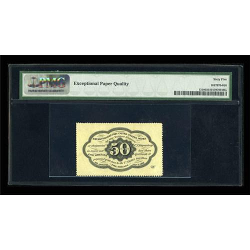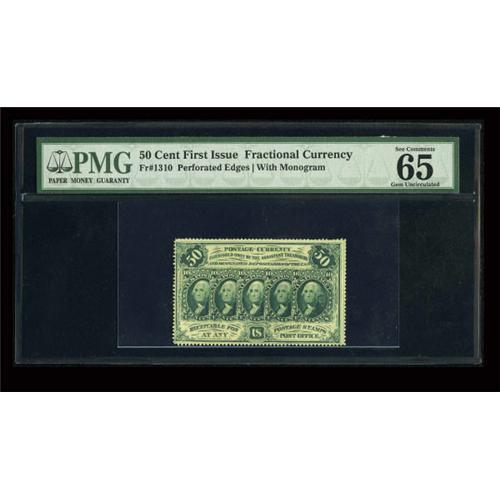 <B>Fr. 1310 50c First Issue PMG Gem Uncirculated 65 EPQ.</B></I> First Issue perforated notes in 65 EPQ are not at all common. PMG has graded 47 examples with only three above this 65 level. The note is bright and attractive, as one would expect, with deep perforations all around and excellent centering.<BR><BR><b>Shipping:</b> Coins & Currency (<a target="_blank" href="http://www.heritageauctions.com/common/shipping.php">view shipping information</a>)