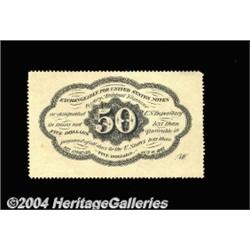 Fr. 1310 50c First Issue Very Choice New. A near Gem example of this popular perforated type. The colors are excellent, and the note is perforated all the way around. <BR><BR><B>Important notice:</B> Heritage usually auctions material at the rate of 200-250 lots per hour. On some occasions eBay Live bid software or the Internet may not be able to keep up with the pace of the auction. We recommend placing a realistic absentee bid now as insurance to avoid disappointment. Occasionally the auctioneer may eliminate or reject an eBay Live bid, and the auctioneer may also reopen a lot after the close of the eBay live bidding (usually because we missed an audience bid), and may reject your bid even if it shows you as the winning bidder. By bidding via eBay Live, you agree that Heritage may award the lot to another bidder at its sole discretion under the circumstances described above or any other reasonable circumstances. Since eBay bids are not shown to us until we open the lot on the floor, we treat those bids just like floor bids. In most cases the floor responds before the eBay bid is presented to us, due to Internet lag time, so for consistency we have made it a policy that floor bids are always considered first over tie eBay live bids. Also please note that all Heritage lots purchased through eBay Live carry a 20% Buyer's Premium. Please make sure you read the Terms and Conditions before you bid. <BR><BR><B>IMPORTANT ANNOUNCEMENT ABOUT RESERVES:</B> Heritage now divulges all reserves on its web site 7 days before every auction. If you want to know whether the reserve on this lot has been met, and if not, what the reserve amount is, please visit this lot page on the HeritageCoin.com web site, or email: bid@HeritageGalleries.com
