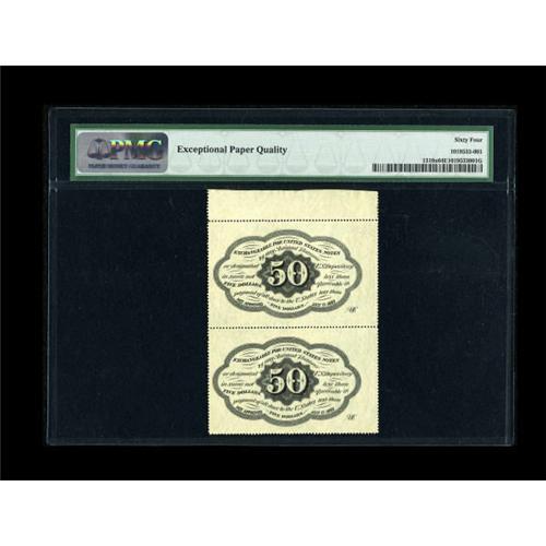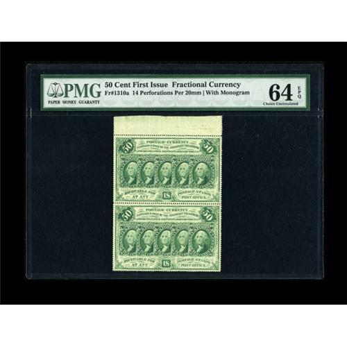 <B>Fr. 1310a Fr. 1310a Milton 1R50.3d 50¢ First Issue Perf. 14 Vertical Pair PMG Choice Uncirculated 64 EPQ.</B></I> This pair has no folds and it's well perforated, with excellent face margins and with the wide top selvage intact. This is the extremely rare perforated 14 variety. Perforated 14 refers to the number of perforations per 20mm of edge length. The normal perforations on First Issue Notes are larger: perf. 12, or 12 perforations per 20mm of edge length. The generally accepted history of these more-tightly-perforated notes is that they were conjured-up from two imperforated sheets by dealer Harlan P. Smith around 1890. Although there is no documentary evidence, there is considerable circumstantial evidence that Smith perforated these sheets himself. As Blake, Valentine, Limpert and Rothert listed this variety as genuine, it remains highly desirable and collectible in spite of its private production. Until now only one other pair was known to exist, part of the Crofoot Collection in the Smithsonian. Perhaps this may be part of a vertical strip of four which was in the F.C.C. Boyd estate. In September, the Mayer example, which was not as nice as this piece, realized over $6000.<BR><BR><b>Shipping:</b> Coins & Currency (<a target="_blank" href="http://www.heritageauctions.com/common/shipping.php">view shipping information</a>)