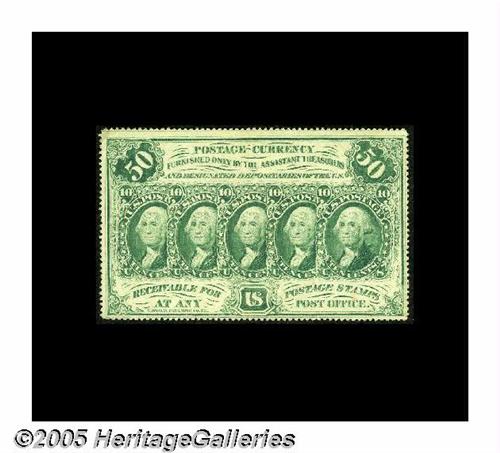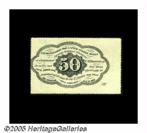 <B>Fr. 1310a Milton 1R50.3d 50¢ First Issue Perforated 14 Choice New.</B></I> Perforated 14 refers to the number of perforations per 20 millimeters of edge length. The normal perforations, on all other First Issue Fractional notes, are slightly larger: perf. 12, or 12 perforations per 20 millimeters of edge length. The generally accepted history of these smaller perforated notes is that they were produced from two sheets by dealer Harlan P. Smith circa 1890. Although there is no documentary evidence, there is considerable circumstantial evidence that Smith perforated these sheets himself. As this variety was listed by Blake, Valentine, Limpert and Rothert as genuine, it remains highly desirable and collectable in spite of its possible private perforation. We have handled seven of these Fr. 1310a's in our 40 sales, including an About New vertical pair in the Friedberg Sale. The most recent example was a Choice New in January of 2001 which realized $4180. This piece is in typical grade for these: fully uncirculated and well perforated, but not terribly bright. As with all known 1310a's, the back is off center to the left. This piece was previously lot 224 of our January 1994 Wayne Liechty sale.