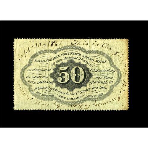 <B>Fr. 1311 50¢ First Issue Very Fine.</B></I> A fully perforated no-monogram 50¢ note with an inscription on the back that dates to the week these notes were released, "September 10, 1862 This is the first of this currency taken by N.H. Gleason." A scarce number made additionally desirable by the contemporary manuscript.<BR><BR><b>Shipping:</b> Coins & Currency (<a target="_blank" href="http://www.heritageauctions.com/common/shipping.php">view shipping information</a>)