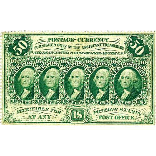 <B>Fr. 1311 50c First Issue New.</B></I> This uncommon Friedberg number is perforated on three sides due to its original position on its sheet. A faint spot is noticed at top center, the green ink could be a little darker, and the back is centered low. Still elusive and at least thirty times scarcer than Friedberg 1312.
