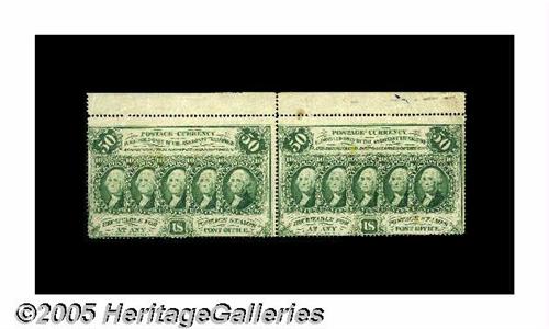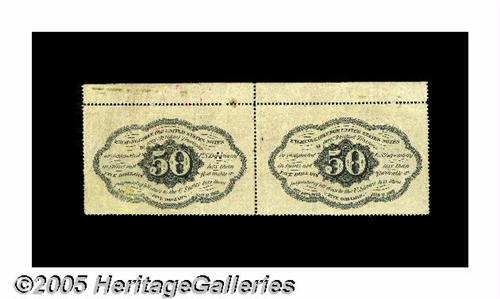 <B>Fr. 1311 Milton 1R50.2 50¢ First Issue Horizontal Pair Extremely Fine.</B></I> From our sale of the Milt Friedberg Collection, where its interesting history was described, "All perforated multiples are very rare, and Fr. 1311 particularly so. This pair, which contains its top margin selvage, is of added interest due to its illustrious pedigree and previous incorrect description. It went from David Proskey to George Blake, and later to the 1969 MANA auction as a small perforated pair. The lengthy description in that catalog included the information, 'Perf 16 . . . This item is unique and cannot be duplicated according to the statement of Mr. Blake.' It's certainly very rare and it may well be unique, but not because the perforations are the smaller number 16. They are the standard 12." At our 1997 Friedberg Sale, this pair realized $660. It should do considerably better this evening.