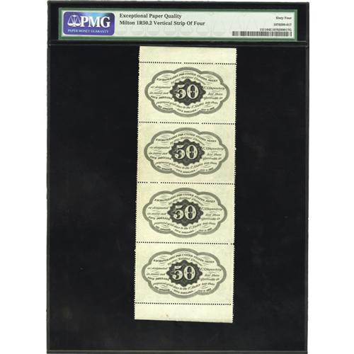 <B>Fr. 1311 Milton 1R50.2 50¢ First Issue Vertical Strip of Four PMG Choice Uncirculated 64 EPQ.</B></I> From our sale of the Milt Friedberg Collection where it was described, "But for the lightest of handling marks, this vertical strip of no-monogram perforated 50¢ notes is absolutely pristine. It's as bright and fresh as the day it was printed. All perforated multiples are rare; we've handled less than a dozen in our 30 years of dealing, and this no-monogram Fifty Cent strip is excessively rare. The top and bottom notes each contain the original selvage from the sheet. This is an extraordinary item." (7500-up)<BR><I>From the Currency Auctions of America January 10, 1997 Milt Friedberg Sale Lot 510. Previously from NASCA's January 15, 1977 auction Lot 3277.<BR>From The Frederick Mayer Collection</B></I><BR><BR><b>Shipping:</b> Coins & Currency (<a target="_blank" href="http://www.heritageauctions.com/common/shipping.php">view shipping information</a>)