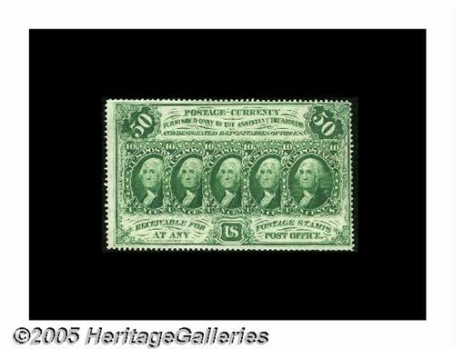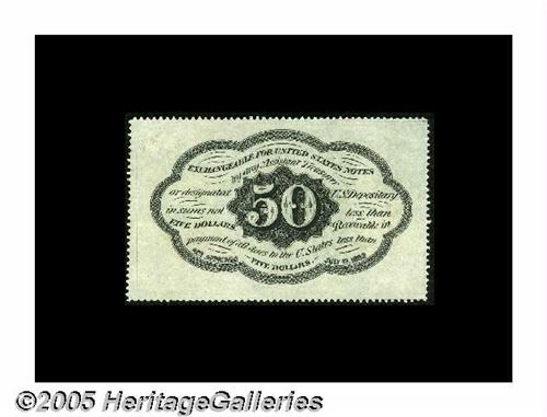 <B>Fr. 1311 Milton 1R50.2a 50¢ First Issue Very Choice New.</B></I> Excellent original paper surfaces and full, deep perforations all the way around highlight this bright, well-printed, rare note. The back centering is perfect, and the face centering is irregular, with small, medium and large margins, the smallest of which touches the frame line but is clear of the design. Very rare in this grade.