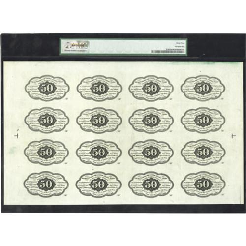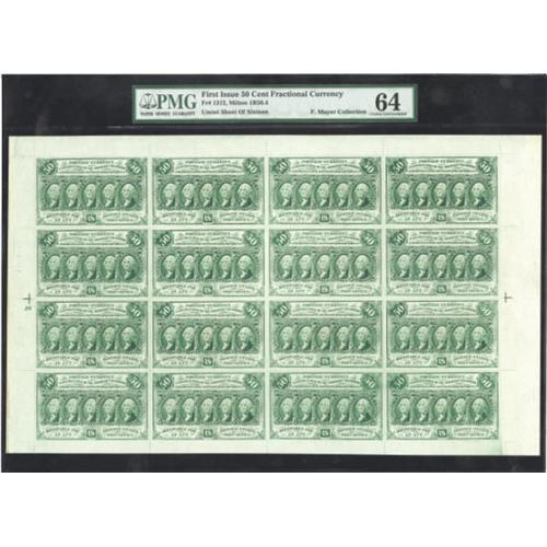 <B>Fr. 1312 50¢ First Issue Complete Sheet of 16 PMG Choice Uncirculated 64.</B></I> Fifty Cent Sheets are far rarer than the lower denominations. Fewer were saved, as the eight-dollar face value was a hefty sum, and many that were saved were cut over the years to supply Gem singles. Today's discerning market should carry this attractive high-grade sheet far past the level of the three lower-denomination sheets. We would not be at all surprised to see this reach or exceed... (7500-up)<BR><I>From The Frederick Mayer Collection</B></I><BR><BR><b>Shipping:</b> Coins & Currency (<a target="_blank" href="http://www.heritageauctions.com/common/shipping.php">view shipping information</a>)