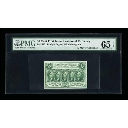 <B>Fr. 1312 50¢ First Issue PMG Gem Uncirculated 65 EPQ.</B></I> Huge margins surround the face on this bright and most attractive First Issue 50¢ note. The grading seems like it might be a touch conservative for this pretty piece. (750-up)<BR><I>From The Frederick Mayer Collection</B></I><BR><BR><b>Shipping:</b> Coins & Currency (<a target="_blank" href="http://www.heritageauctions.com/common/shipping.php">view shipping information</a>)