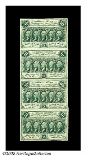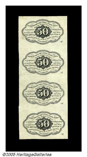 <B>Fr. 1312 50¢ First Issue Vertical Strip Of Four About New.</B></I> Beautifully margined and fully bright. First Issue multiples are quite scarce.