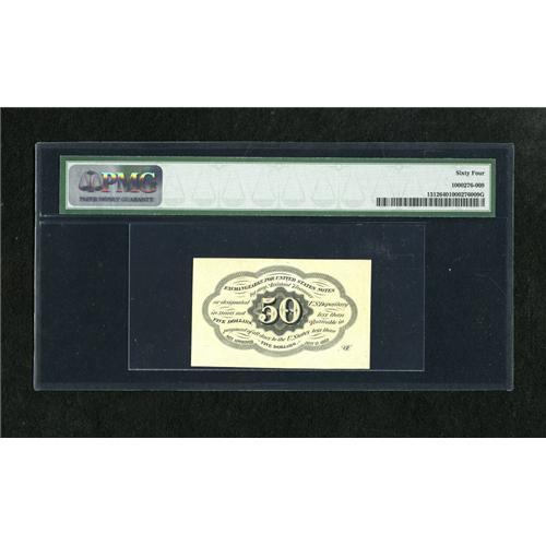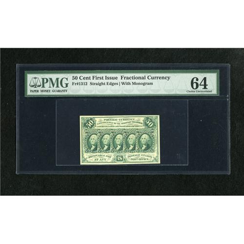 <B>Fr. 1312 50c First Issue PMG Choice Uncirculated 64.</B></I> A lovely example of this straight edge with monogram type that has bold ink colors, bright paper surfaces and a great deal of charm.<BR><BR><b>Shipping:</b> Coins & Currency (<a target="_blank" href="http://www.heritageauctions.com/common/shipping.php">view shipping information</a>)