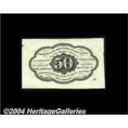 Fr. 1312 50c First Issue Superb Gem New. An extraordinary example of this First Issue 50c type. The note has ideal color, perfect centering of both sides and broad margins all around. The margins are slightly irregular, but huge at all points, framing the note beautifully. The back shows the superscript "th" that followed a plate number. <BR><BR><B>Important notice:</B> Heritage usually auctions material at the rate of 200-250 lots per hour. On some occasions eBay Live bid software or the Internet may not be able to keep up with the pace of the auction. We recommend placing a realistic absentee bid now as insurance to avoid disappointment. Occasionally the auctioneer may eliminate or reject an eBay Live bid, and the auctioneer may also reopen a lot after the close of the eBay live bidding (usually because we missed an audience bid), and may reject your bid even if it shows you as the winning bidder. By bidding via eBay Live, you agree that Heritage may award the lot to another bidder at its sole discretion under the circumstances described above or any other reasonable circumstances. Since eBay bids are not shown to us until we open the lot on the floor, we treat those bids just like floor bids. In most cases the floor responds before the eBay bid is presented to us, due to Internet lag time, so for consistency we have made it a policy that floor bids are always considered first over tie eBay live bids. Also please note that all Heritage lots purchased through eBay Live carry a 20% Buyer's Premium. Please make sure you read the Terms and Conditions before you bid. <BR><BR><B>IMPORTANT ANNOUNCEMENT ABOUT RESERVES:</B> Heritage now divulges all reserves on its web site 7 days before every auction. If you want to know whether the reserve on this lot has been met, and if not, what the reserve amount is, please visit this lot page on the HeritageCoin.com web site, or email: bid@HeritageGalleries.com
