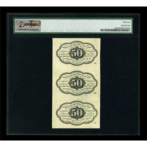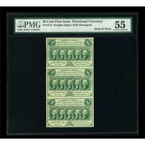 <B>Fr. 1312 50c First Issue Vertical Strip of Three PMG About Uncirculated 55.</B></I> All Fifty Cent multiples are scarce and it has been several years since we last were able to offer a strip of three.<BR><BR><b>Shipping:</b> Coins & Currency (<a target="_blank" href="http://www.heritageauctions.com/common/shipping.php">view shipping information</a>)
