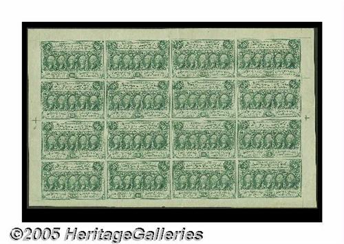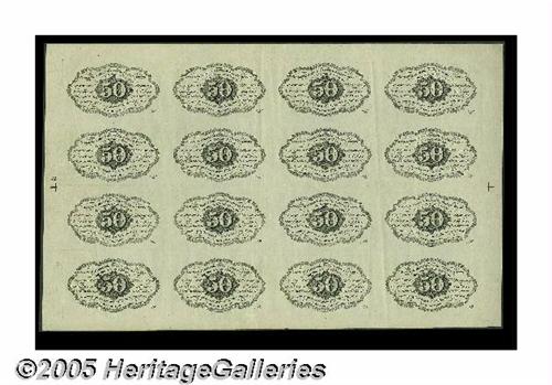 <B>Fr. 1312 Milton 1R50.4b 50¢ First Issue Full Sheet of Sixteen Extremely Fine.</B></I> An incredibly nice-looking sheet that has a number of very light folds. The sheet has its full selvage, great inking quality and no faults save for the minor folds. Fifty-cent first issue sheets are not often seen.