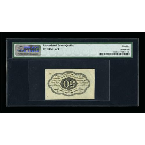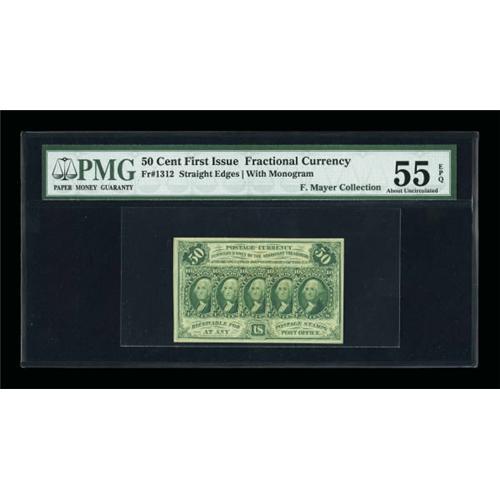 <B>Fr. 1312 Milton 1R50.4c 50¢ First Issue Inverted Back PMG About Uncirculated 55 EPQ.</B></I> From our May 2005 sale of the Tom O'Mara Collection. It was described there, "About a half-dozen examples of this Invert are known, but most are quite heavily circulated. Milt Friedberg owned two, both of which graded Fine. This piece would be a perfect Gem but for two corner folds." Tom had acquired it from Stack's in May of 2004 at $1600, and in the sale of Tom's collection a year later, Mr. Mayer paid $2160 for it. Now, two years later, in a considerably more sophisticated market, we would not be at all surprised to see this originally embossed, beautifully bright piece realize... (3500-up)<BR><I>From The Frederick Mayer Collection</B></I><BR><BR><b>Shipping:</b> Coins & Currency (<a target="_blank" href="http://www.heritageauctions.com/common/shipping.php">view shipping information</a>)