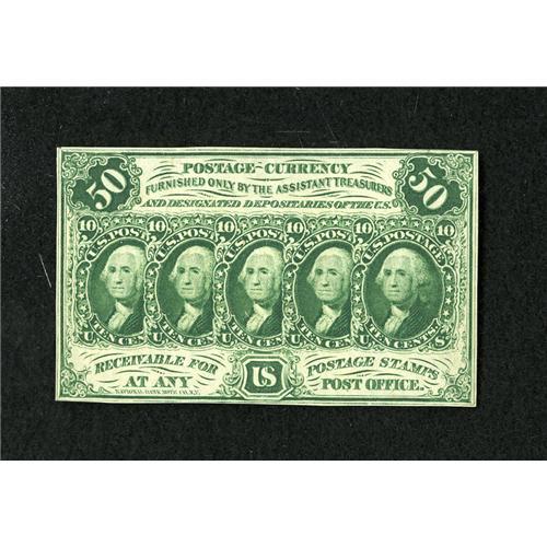<B>Fr. 1313 50c First Issue About New.</B></I> A single centerfold is seen on this much scarcer straight edge without monogram number. Radiant ink colors and superb print quality only enhance the eye appeal of this note.<BR><BR><b>Shipping:</b> Coins & Currency (<a target="_blank" href="http://www.heritageauctions.com/common/shipping.php">view shipping information</a>)