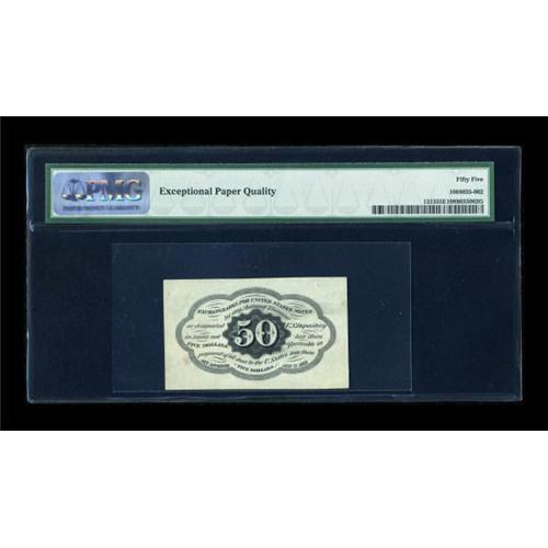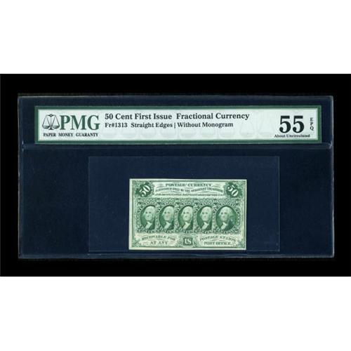 <B>Fr. 1313 50c First Issue PMG About Uncirculated 55 EPQ.</B></I> The very scarce straight-edge no-monogram 50c note. It's got terrific color, and the Exceptional Paper Quality comment testifies to its originality. Very scarce in all grades, and almost never seen as a high-end AU.<BR><BR><b>Shipping:</b> Coins & Currency (<a target="_blank" href="http://www.heritageauctions.com/common/shipping.php">view shipping information</a>)