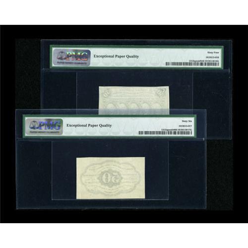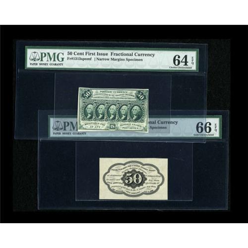 <B>Fr. 1313SP 50¢ First Issue Narrow Margin Pair PMG Gem Uncirculated 64 EPQ and 66 EPQ.</B></I> These two notes are nearly identical in eye appeal. The face grades a touch lower only for a couple of tight margins, a non-issue for the back which, has plenty of empty space between the design and the edges.<BR><BR><b>Shipping:</b> Coins & Currency (<a target="_blank" href="http://www.heritageauctions.com/common/shipping.php">view shipping information</a>)