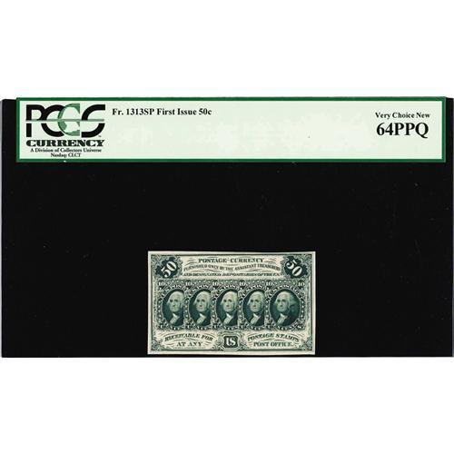 <B>Fr. 1313SP 50c First Issue Narrow Margin Face PCGS Very Choice New 64PPQ.</B></I> Bright paper and dark green ink make this a very nice narrow margin specimen.