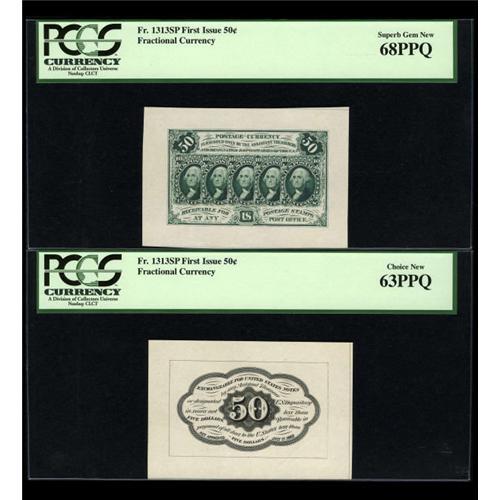 <B>Fr. 1313SP 50¢ First Issue Wide Margin Pair PCGS Superb Gem New 68PPQ Face and 63PPQ Back.</B></I> The face of this lovely pair is the stand-out with its 68PPQ grade. The back, although just as bright and pretty, shows some handling, which accounts for its far lower grade. <BR><BR><b>Shipping:</b> Coins & Currency (<a target="_blank" href="http://www.heritageauctions.com/common/shipping.php">view shipping information</a>)