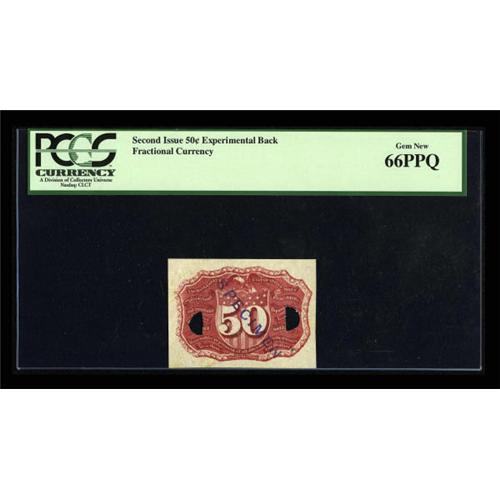<B>Milton 2E50R.3 50c Second Issue Experimental PCGS Gem New 66PPQ.</B></I> A perfectly centered piece with a boldly printed crimson design.<BR><BR><b>Shipping:</b> Coins & Currency (<a target="_blank" href="http://www.heritageauctions.com/common/shipping.php">view shipping information</a>)