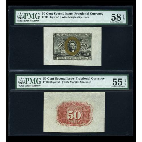 <B>Fr. 1314SP 50c Second Issue Wide Margin Pair PMG Choice About Unc 55 EPQ & 58 EPQ.</B></I> A most attractive Second Issue 50c pair. The face has been PMG graded 58 EPQ, and the back just under it at 55 EPQ. <BR><BR><b>Shipping:</b> Coins & Currency (<a target="_blank" href="http://www.heritageauctions.com/common/shipping.php">view shipping information</a>)