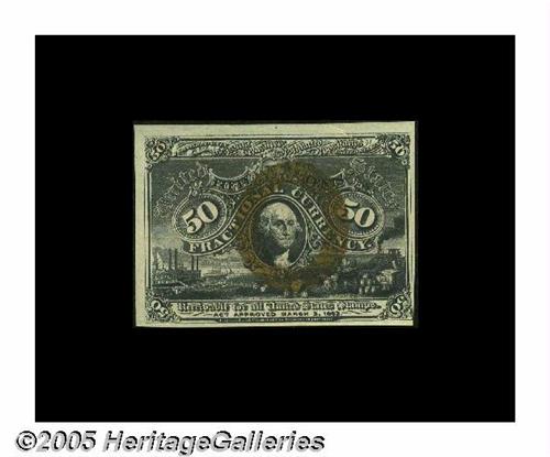 <B>Fr. 1316 Milton 2R50.2b 50¢ Second Issue About New.</B></I> An intriguing minor error where the bronze back surcharges are shifted so far to the left that part of the "5" from the large "50" is off the edge of the note. This same shift has caused the "18" to miss the note completely, and the "18" from the next subject to enter the note at the right. This has caused there to be no corner surcharge in the lower left, and the "63" and the "18" are at the lower right.