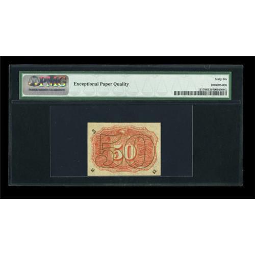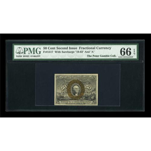 <B>Fr. 1317 50¢ Second Issue PMG Gem Uncirculated 66 EPQ.</B></I> PMG has graded 31 examples of this number to date--this is the sole 66, and none have been graded higher. The note has lovely margins, ideal centering, and sharper-than-normal surcharges. A very pretty piece that will not likely remain unique at this grade level, but will certainly remain rare.<BR><I>From The Peter Gamble Collection.</B></I><BR><BR><b>Shipping:</b> Coins & Currency (<a target="_blank" href="http://www.heritageauctions.com/common/shipping.php">view shipping information</a>)
