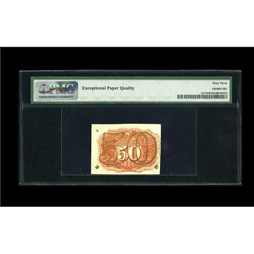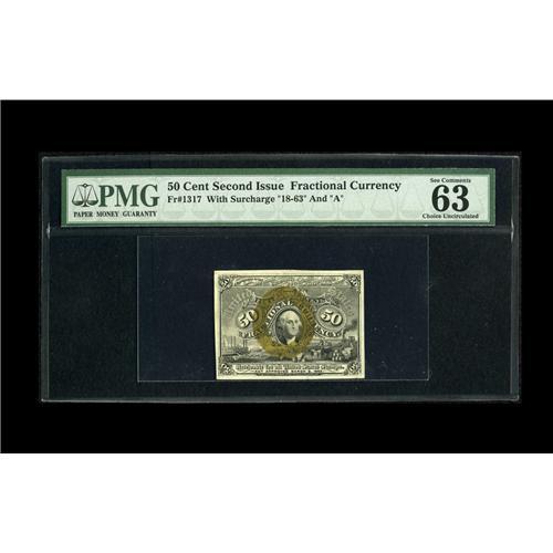 <B>Fr. 1317 50c Second Issue PMG Choice Uncirculated 63.</B></I> This is a very pleasing example of this second issue higher denomination type note which has the typical bright orange back. Plentiful margins are found on this beauty which has bright bronzing and exceptional paper.