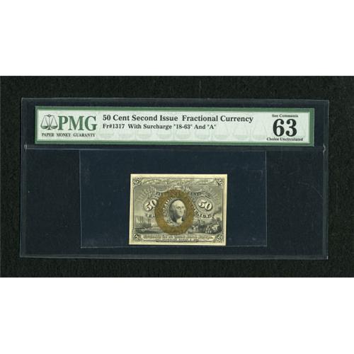 <B>Fr. 1317 50c Second Issue PMG Choice Uncirculated 63 EPQ.</B></I> A very well margined example of this common variety with "A" and "18-63" surcharges.<BR><BR><b>Shipping:</b> Coins & Currency (<a target="_blank" href="http://www.heritageauctions.com/common/shipping.php">view shipping information</a>)