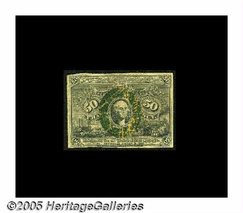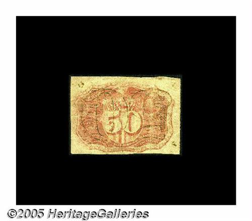 <B>Fr. 1317 Milton 2E50.3e 50¢ Second Issue Inverted Back Surcharge Very Good.</B></I> Unique when the Encyclopedia was printed, and to our best knowledge it remains so today. It was plated both sides on page 69 of Milt's master work. The note is well worn but free of damage or specific problems, and its rarity is unquestioned, whether unique or one of two. It realized $550 when we sold the Friedberg Collection in 1997.