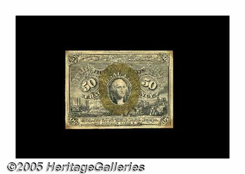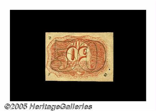 <B>Fr. 1317 Milton 2R50.3d 50¢ Second Issue Inverted Back Engraving New.</B></I> Although listed in the Encyclopedia at the time of its publication in 1978, no examples had been definitively traced. As a group, Second Issue notes with the back engraving inverted are more rare than those with inverted surcharges. About 20 engraving inverts are known, as opposed to about 60 surcharge inverts for all Second Issue notes. The note is fully uncirculated, with the margins and printing quality of an absolute Gem, but the corners of the face are quite aged, apparently from mounting, and there is a sand hole the size of a pinhole near the bottom left corner. These holes, which are seen occasionally on all issues of Nineteenth Century paper money, are manufacturing defects rather than circulation damage. A small piece of grit (sand, stone, newt eyeball, or whatever) is manufactured into the paper. When it falls out, which generally occurs from the pressure of the printing plate, it leaves a small hole. <I>Don Kelly October 1993, CAA MRF 1/97, then to Tom O'Mara.</B></I>