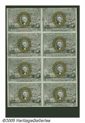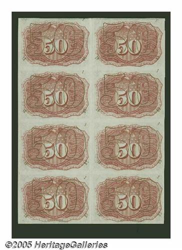 <B>Fr. 1318 50¢ Second Issue Uncut Block Of Eight Choice About New.</B></I> There is a vertical fold between the two columns of notes but each note individually grades either Choice or Gem. Second Issue 50¢ multiples are quite rare. We have handled fewer than a dozen in 40 years of dealing in Fractionals.