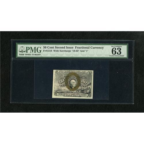 <B>Fr. 1318 50c Second Issue PMG Choice Uncirculated 63 EPQ.</B></I> Fiery ink colors and razor sharp surcharges are found on this higher denomination type that is hindered only by a tight top margin.<BR><BR><b>Shipping:</b> Coins & Currency (<a target="_blank" href="http://www.heritageauctions.com/common/shipping.php">view shipping information</a>)
