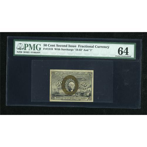 <B>Fr. 1318 50c Second Issue PMG Choice Uncirculated 64.</B></I> This example has broad margins and distinct surcharges.<BR><BR><b>Shipping:</b> Coins & Currency (<a target="_blank" href="http://www.heritageauctions.com/common/shipping.php">view shipping information</a>)