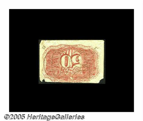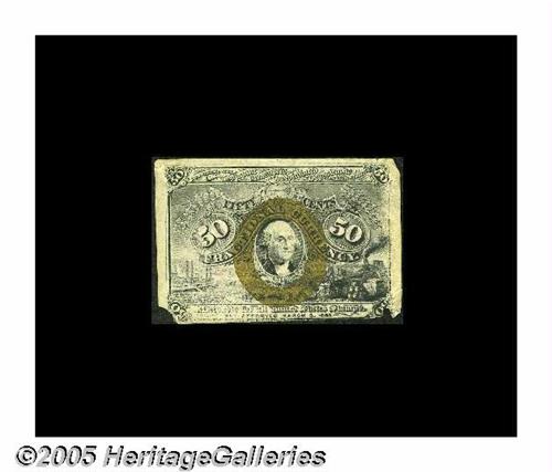 <B>Fr. 1318 Milton 2R50.4b 50¢ Second Issue Entire Back Inverted About New, Damaged.</B></I> Plated face and back on page 69 of Milt's Encyclopedia, this is one of only two examples known. It's damaged at all four corners, apparently from careless removal from a previous mounting. The colors and paper quality are excellent, and the note appears to have been fully uncirculated when it was first mounted. In spite of its damage, its rarity carried it to almost $500 eight years ago.