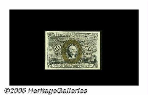 <B>Fr. 1318 Milton 2R50.4c 50¢ Second Issue Inverted Back Surcharge Gem New.</B></I> This is a magnificent grade for any note, let alone a very rare Invert. The margins are broad all the way around, the colors of the ink, paper and bronze are as fresh as the day the note was printed, and the inverted "1-18-63" surcharge is unusually sharp and clear. We believe the census for this piece has risen to four, but it's unlikely that any notes rival this beauty in grade. This note realized over $1,700 on a $1,500 estimate eight years ago, and it should sail well past that number tonight.
