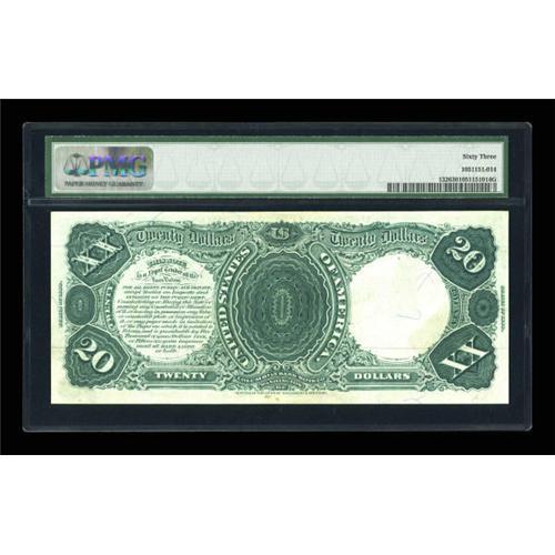 <B>Fr. 132 $20 1880 Legal Tender PMG Choice Uncirculated 63.</B></I> This is the highest grade Fr. 132 to have reached the market. CAA sold this note to the Dauers in our May 2000 sale where it realized $7,150. According to Track & Price, that still remains the record price for Fr. 132, simply because Uncirculated examples do not appear on the market. Of the 48 pieces listed in the census, only four are listed as Uncirculated - none has been on the market since 2000, and we would expect this handsome note, which is pictured on page 98 of the Dauer book, to enter into five-figures. <BR><I>From The Dr. Edward & Joanne Dauer Collection</B></I><BR><BR><b>Shipping:</b> Coins & Currency (<a target="_blank" href="http://www.heritageauctions.com/common/shipping.php">view shipping information</a>)