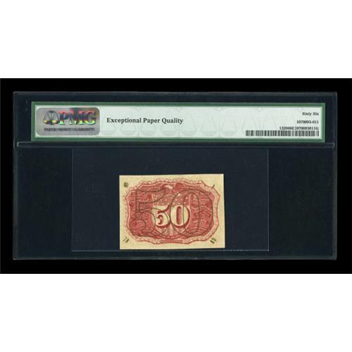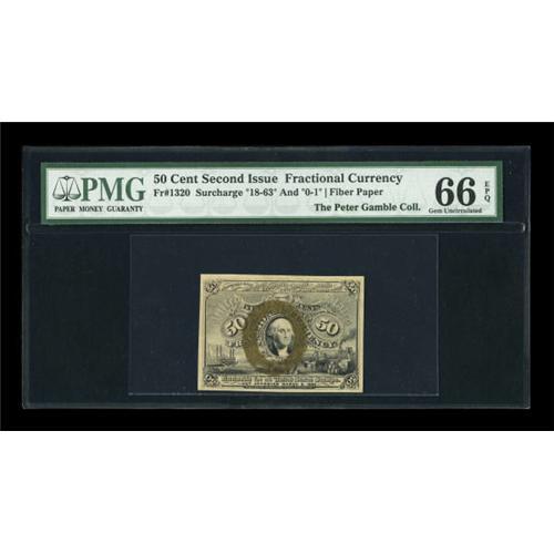 <B>Fr. 1320 50¢ Second Issue PMG Gem Uncirculated 66 EPQ.</B></I> A tough note in any grade, and really rare at this level. PMG has graded only this piece and one other at 66 EPQ and none higher. Second Issue Fiber Paper Fractionals are challenging pieces to locate in high grade as they often had manufacturing defects that lowered the quality - even when the note is Uncirculated. This broadly margined, problem-free piece has none of the typically encountered problems and exhibits nice sharp surcharges, creating a great overall eye appeal.<BR><I>From The Peter Gamble Collection.</B></I><BR><BR><b>Shipping:</b> Coins & Currency (<a target="_blank" href="http://www.heritageauctions.com/common/shipping.php">view shipping information</a>)