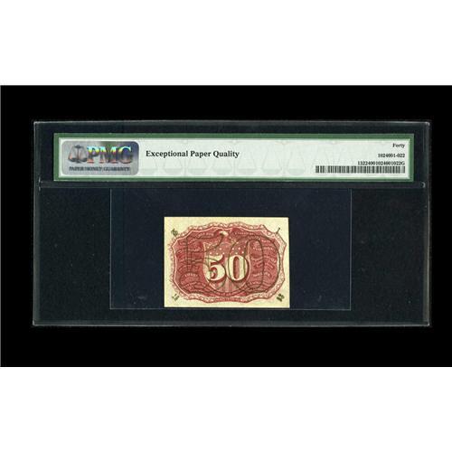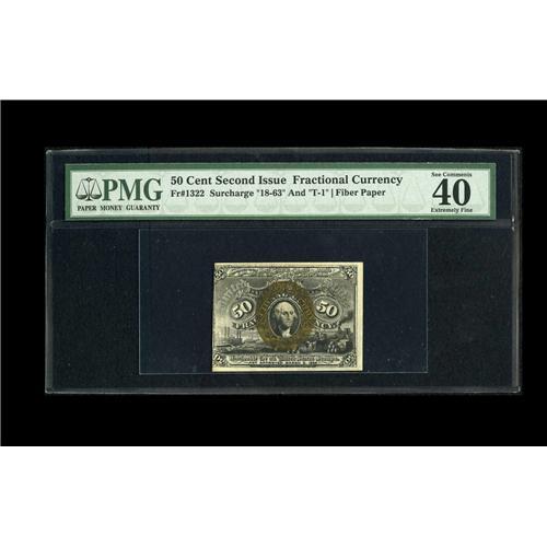 <B>Fr. 1322 50c Second Issue PMG Extremely Fine 40.</B></I> Here is another lovely fiber paper note which certainly appears to be conservatively graded, as this cataloger sees it as being closer to the AU grade. With that said, this is a much scarcer type that has clear surcharges and bright red ink colors.