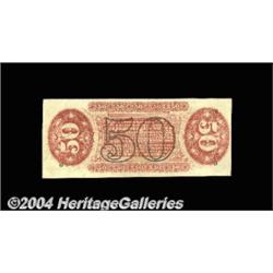 Fr. 1324 50c Third Issue Spinner Choice New. The tight bottom margin holds this nice Red Back Spinner away from the higher grade. <BR><BR><B>Important notice:</B> Heritage usually auctions material at the rate of 200-250 lots per hour. On some occasions eBay Live bid software or the Internet may not be able to keep up with the pace of the auction. We recommend placing a realistic absentee bid now as insurance to avoid disappointment. Occasionally the auctioneer may eliminate or reject an eBay Live bid, and the auctioneer may also reopen a lot after the close of the eBay live bidding (usually because we missed an audience bid), and may reject your bid even if it shows you as the winning bidder. By bidding via eBay Live, you agree that Heritage may award the lot to another bidder at its sole discretion under the circumstances described above or any other reasonable circumstances. Since eBay bids are not shown to us until we open the lot on the floor, we treat those bids just like floor bids. In most cases the floor responds before the eBay bid is presented to us, due to Internet lag time, so for consistency we have made it a policy that floor bids are always considered first over tie eBay live bids. Also please note that all Heritage lots purchased through eBay Live carry a 20% Buyer's Premium. Please make sure you read the Terms and Conditions before you bid. <BR><BR><B>IMPORTANT ANNOUNCEMENT ABOUT RESERVES:</B> Heritage now divulges all reserves on its web site 7 days before every auction. If you want to know whether the reserve on this lot has been met, and if not, what the reserve amount is, please visit this lot page on the HeritageCoin.com web site, or email: bid@HeritageGalleries.com