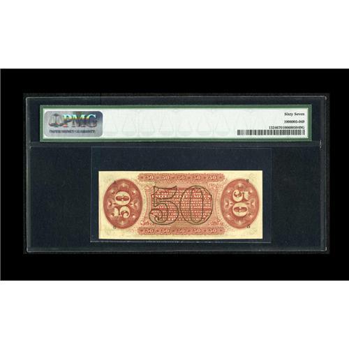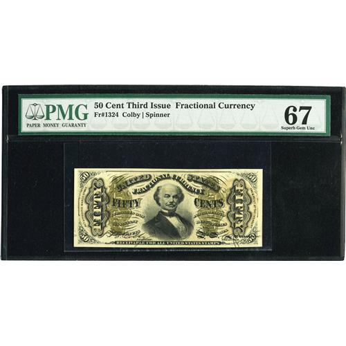 <B>Fr. 1324 50c Third Issue Spinner PCGS Superb Gem New 67.</B></I> This attractive note boasts larger than normal margins, a bright red back, and pleasing color overall. The book <I>100 Greatest American Currency Notes</B></I> ranks this design at No. 51.<BR><I>From The Troy Wiseman Collection</B></I>