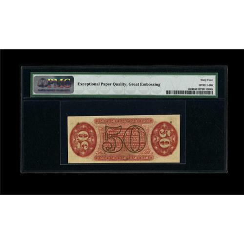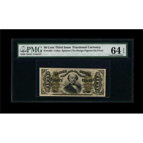 <B>Fr. 1324 50c Third Issue Spinner PMG Choice Uncirculated 64 EPQ.</B></I> At first glance this note appears to be a full Gem, but the margin at upper right is a touch close. Great embossing is easily seen through the third party holder.<BR><BR><b>Shipping:</b> Coins & Currency (<a target="_blank" href="http://www.heritageauctions.com/common/shipping.php">view shipping information</a>)
