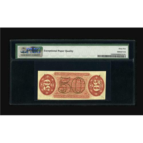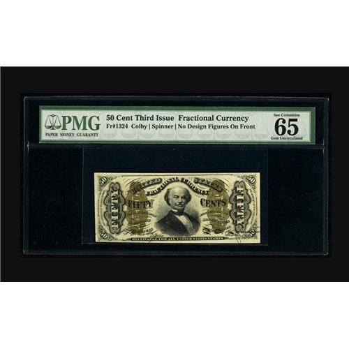 <B>Fr. 1324 50c Third Issue Spinner PMG Gem Uncirculated 65 EPQ.</B></I> A delightful example of this red back Spinner type that has bright bronzing, good color and a nearly complete plate number "61" on the lower back corner.<BR><BR><b>Shipping:</b> Coin/Currency (<a target="_blank" href="http://www.heritageauctions.com/common/shipping.php">view shipping information</a>)