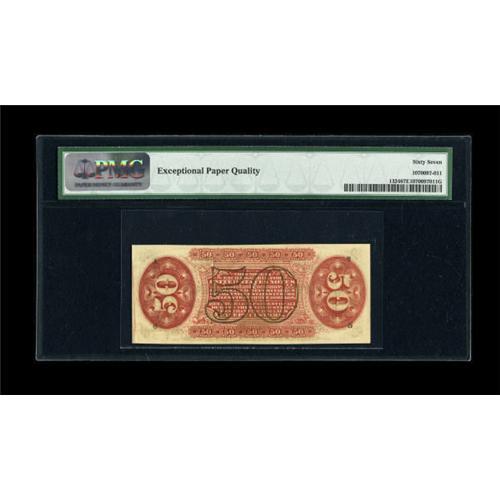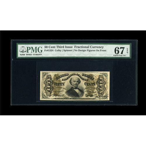 <B>Fr. 1324 50c Third Issue Spinner PMG Superb Gem Unc 67 EPQ.</B></I> The last appearance of a Superb quality example of this issue to pass through our auctions was well over a year ago. This piece shows perfectly even and unwavering margins that frame a deeply printed design with bold overprints.<BR><BR><b>Shipping:</b> Coins & Currency (<a target="_blank" href="http://www.heritageauctions.com/common/shipping.php">view shipping information</a>)
