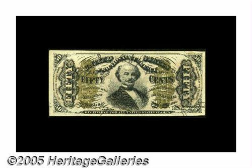 <B>Fr. 1324 Milton 3R50.16 50¢ Third Issue Spinner Courtesy Autograph Superb Gem New.</B></I> Courtesy autographed by James Gilfillan above Spinner's head, with the dates of his service as Treasurer, 1877-1883, to the left of Spinner's portrait and, "Treas. US" to the right of the portrait. A rather interesting note for two reasons: first, Gilfillan is a relatively common courtesy autograph on Large Type but is very rarely seen on Fractional, and second, the host note is a Superb Gem: broadly margined, bright and strictly original. Tom purchased this note from our September 2000 Sale, where on a much less lively Fractional market it realized $495.