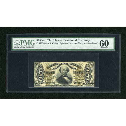 <B>Fr. 1324SP 50c Third Issue Spinner Narrow Margin Face PMG Uncirculated 60.</B></I> A poor top trim is noticed on this Spinner specimen that has retained heavy shield remnants.<BR><BR><b>Shipping:</b> Coins & Currency (<a target="_blank" href="http://www.heritageauctions.com/common/shipping.php">view shipping information</a>)