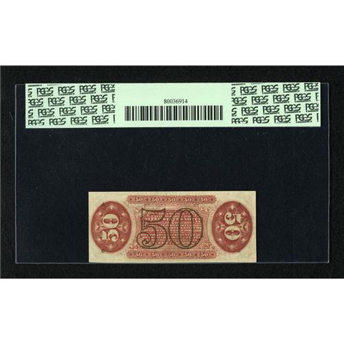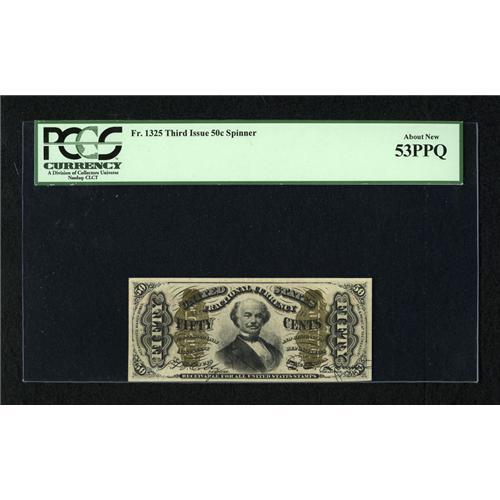 <B>Fr. 1325 50 Third Issue Spinner PCGS About New 53PPQ.</B></I> A lovely "1" and "a" Red Back Spinner with perfect color, clearly original paper surfaces, and tons of eye appeal. A tough number to find in any grade. The majority that we've handled are either heavily circulated or prohibitively expensive fully Uncirculated pieces. Original high-end Circs, such as this piece, are almost never encountered.<BR><BR><I>From The Bill and Kathy Stella Currency Collection</B></I><BR><BR><b>Shipping:</b> Coins & Currency (<a target="_blank" href="http://www.heritageauctions.com/common/shipping.php">view shipping information</a>)