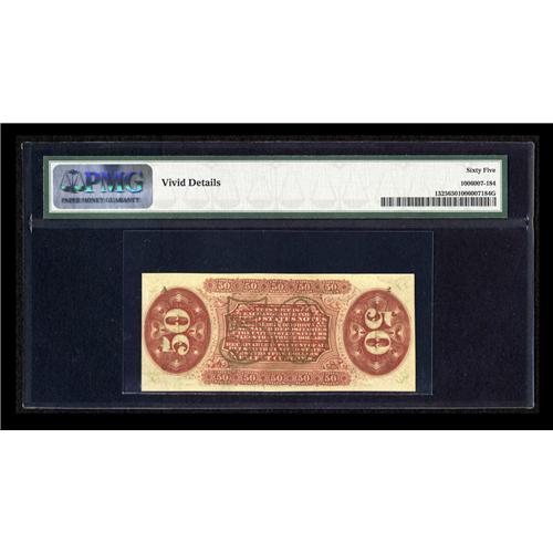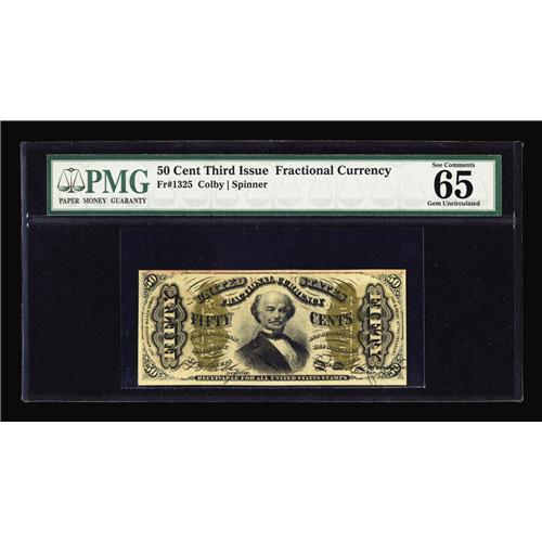 <B>Fr. 1325 50¢ Third Issue Spinner PMG Gem Uncirculated 65.</B></I> PMG has commented, "Vivid Details" on this "1" and "a" Red Back Spinner.