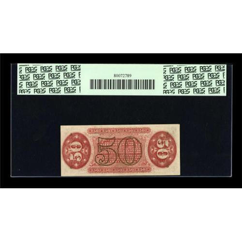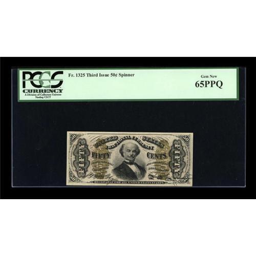 <B>Fr. 1325 50c Third Issue Spinner PCGS Gem New 65PPQ.</B></I> A particularly nice example of this "1" and "a" Red Back Spinner. The face margins easily support the 66 grade, but the note is held to 65 by the back centering, which is a little off to the left although clear of the edge. The deep, original embossing can be easily seen through the third-party holder. PCGS has not graded any 1325 above this level.<BR><I>From The Thomas M. Flynn Collection</B></I><BR><BR><b>Shipping:</b> Coins & Currency (<a target="_blank" href="http://www.heritageauctions.com/common/shipping.php">view shipping information</a>)